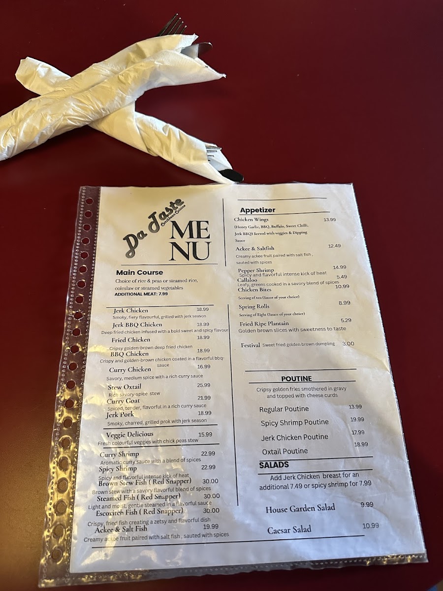 Da Taste offers a relaxed and inviting Jamaican menu that reflects the vibrant comfort of island flavors. The selections cater to both casual meals and leisurely gatherings, featuring hearty dishes like oxtail, jerk chicken roti, and savory goat roti. These meals are well suited for lunch or dinner, providing satisfying options for those seeking rich, home-style Caribbean cuisine.